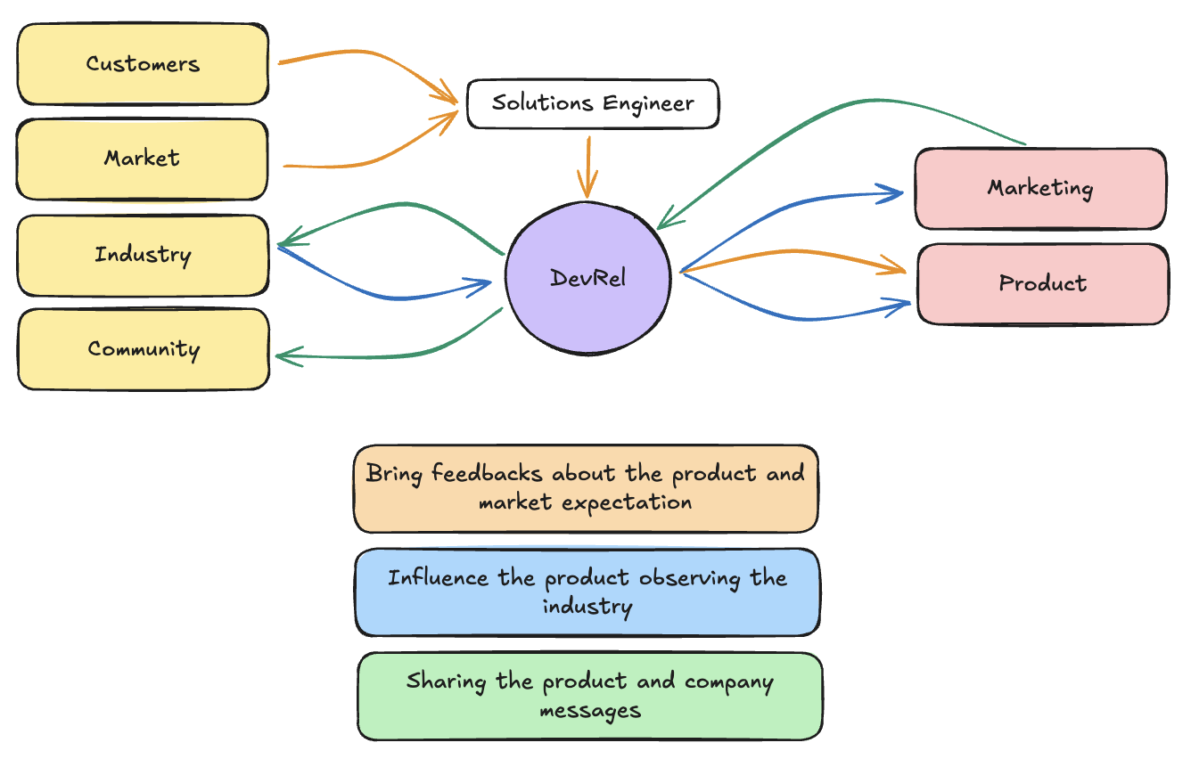 Based on what we discussed earlier, we can summarize the role of a DevRel as that of an orchestrator who facilitates the flow of information between the product and the outside world, and vice versa.